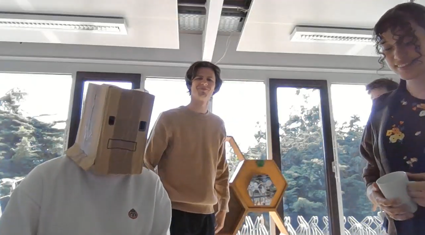 Participants decide on who will act as the robot and who will be actors, and grab at random one card from each category. The actors set the setting and the robot applies the modifier to its capabilities. Then the robot will try to achieve its goal in the given setting, whilst expressing itself through its body and sounds. To create the need to express in that way, we decided to add a small box to be over the robot actors head, so the face will not be part of expression. This also helps to get more into the head of ROSE. By creating this bodystorming environment, designers can really feel what it would be like to be in the scenario and the possible weird combinations help to see things from a perspective that would not have been explored otherwise. If designers already have a specific scenario they want to test, they can leave out the surrounding or goal card and insert their own.