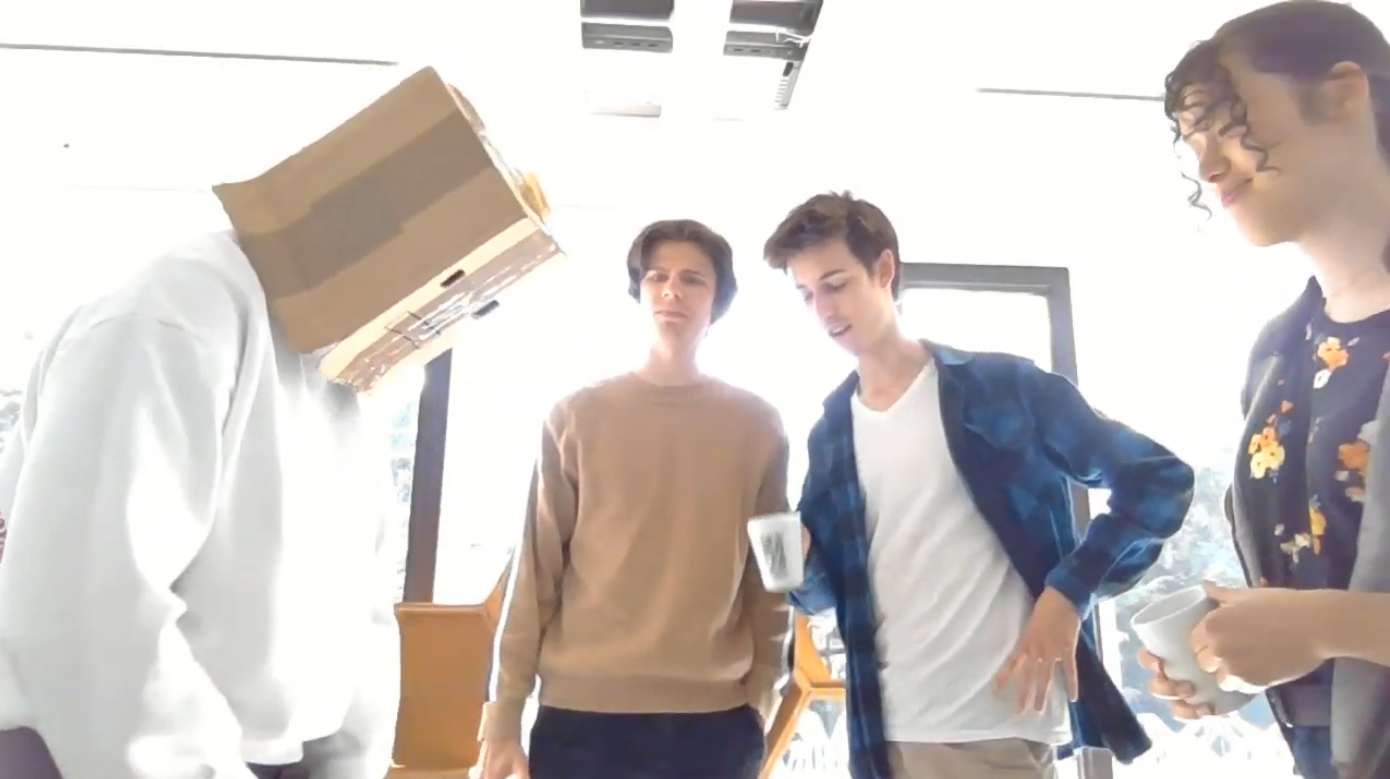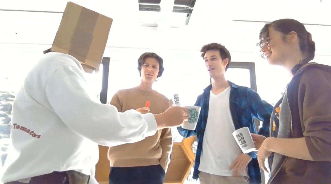 We tested this Robot Expression Tool in our group with the cards of The Restaurant (Location), Does not speak English (Modifier) and Move an Object (Goal), shown in Figure 3.2 above. One person acted as the robot with the box over their head, to remove the facial expression, three other group members acted out a scenario and the last member acted as an observer.  Below, in Figure 3.3 till 3.6, are some snapshots and a short clip of our test.