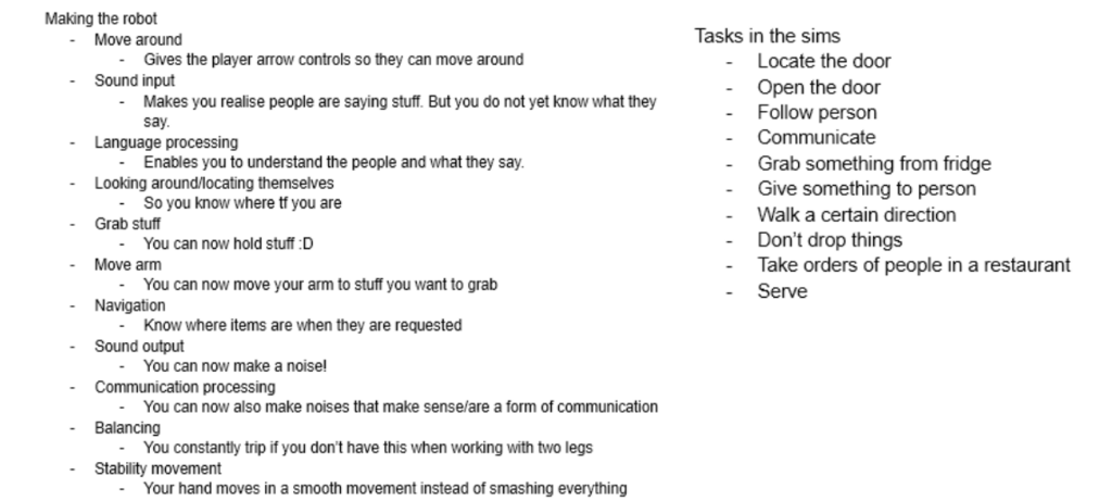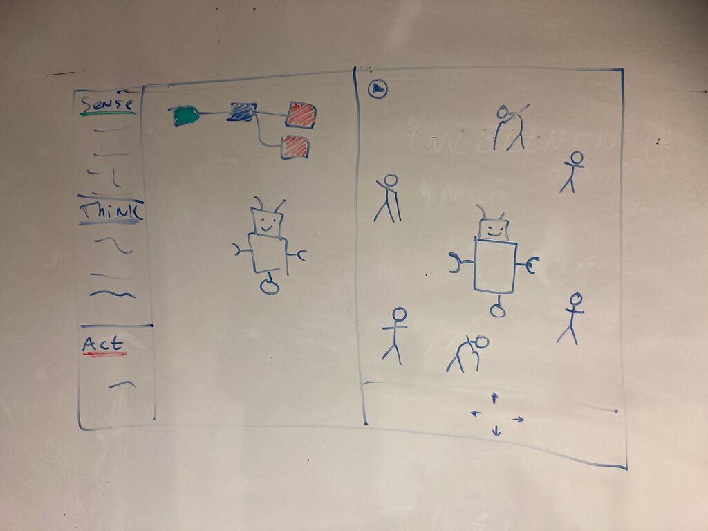 This week's challenge is to create a tool that will help prototyping (high level) robot behaviour, preferably without the use of Wizard of Oz. As we did not want to make use of Wizard of Oz and getting an actual robot was a bit expensive, we started to look into virtual robots. Our initial idea was to create a tool that would allow users to design and test their robot in a Sims like universe:  1) One would first program and design their own simple robot. 2) Once finished they receive tasks to complete. 3) Doing these tasks would give insight into the behaviour of the robot and what is still missing.