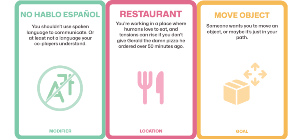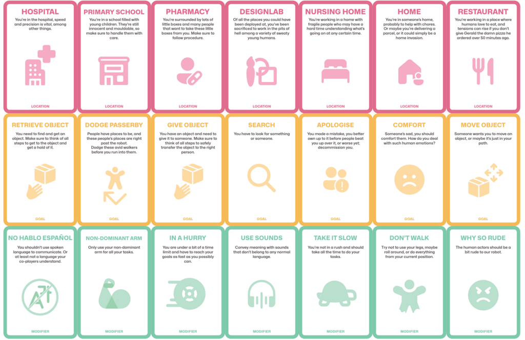 The second tool that we created was to develop expressive behaviour of a social robot. As it is  difficult for a ROSE to show emotion on its face, we wanted to lay a focus on expression through the body. This can be done through motion (gestures, movements), sounds, morphology, haptics or a controlled version of ROSE. We discussed how a combination of these categories could help to develop expressive behaviour and what message ROSE would then try to convey. The idea of using sound was also quite interesting as there is a wide variety and range of sounds that could be incorporated. We also thought about combining sounds with improv, where there are several prompt cards and you have to act those out through sound. However, using just sound felt a bit too limited so we expanded on the acting out. The tool provides participants with prompts in three different categories: 1) Location, 2) Goal, and 3) Modifier. The cards can be seen below in Figure 3.1.