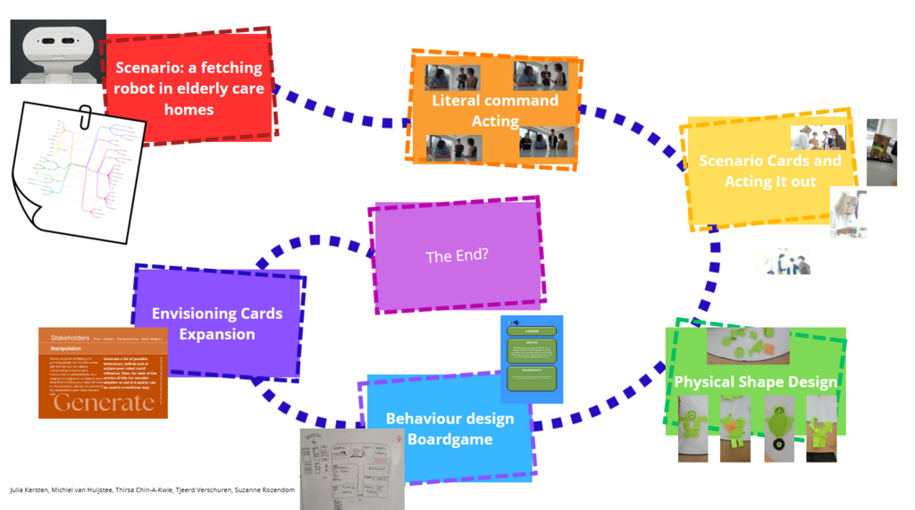 This week we continued with creating a scenario-based design method for social robot design. To address this, we first examined possible tools that already exist, such as storyboarding, improv theater, bodystorming, brainstorming and a vision board and also looked into Botanist writing (planned and structured) VS Gardener writing (start and go with the flow). After having a more clear understanding of the existing tools we started to generate ideas and elements we could use in our own tool. Several ideas were: 1) Use of visuals, 2) Use of music, 3) Incorporate LEGO or Playmobile figures, 4) A Dungeons and Dragons type of storytelling, 5) Finding inspiration in one's surroundings, 5) Creating a comfortable environment and 6) Incorporating game elements.