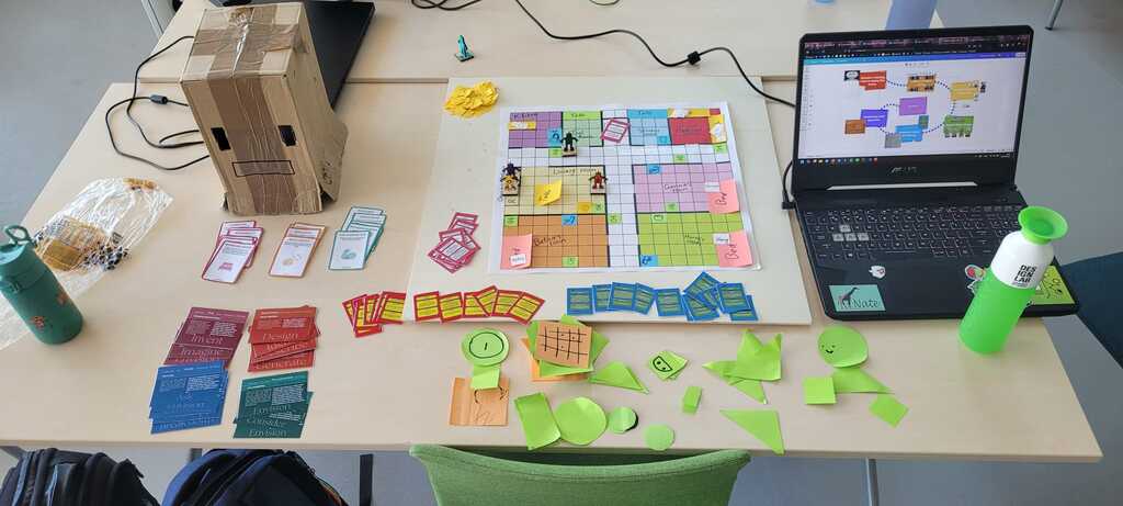 We created the board and the pieces (Figure 6.6) and came up with several rules which would guide the players and made a layout of the turns that the players would be taking. There are however still some aspects that need some fine tuning, such as the precise amount of steps that can be taken per turn and the balancing of the action and goal cards. Because we did not have the time to extensively playtest the game several times, and have others test the game to see if the game elements are in balance for those that did not develop the game, we cannot make any statements about the effectiveness of the game in this current state. With time however, the game can be optimised and possibly expanded to fit the goal of prototyping Social Robot Behaviour and hopefully be as effective as Degrees of Freedom [5]. In its current state, the game is fun and helps players to think about robot components and possible scenarios the Social Robot could encounter and what type of behaviour is needed in said scenario, and what parts are necessary to act out that behaviour.