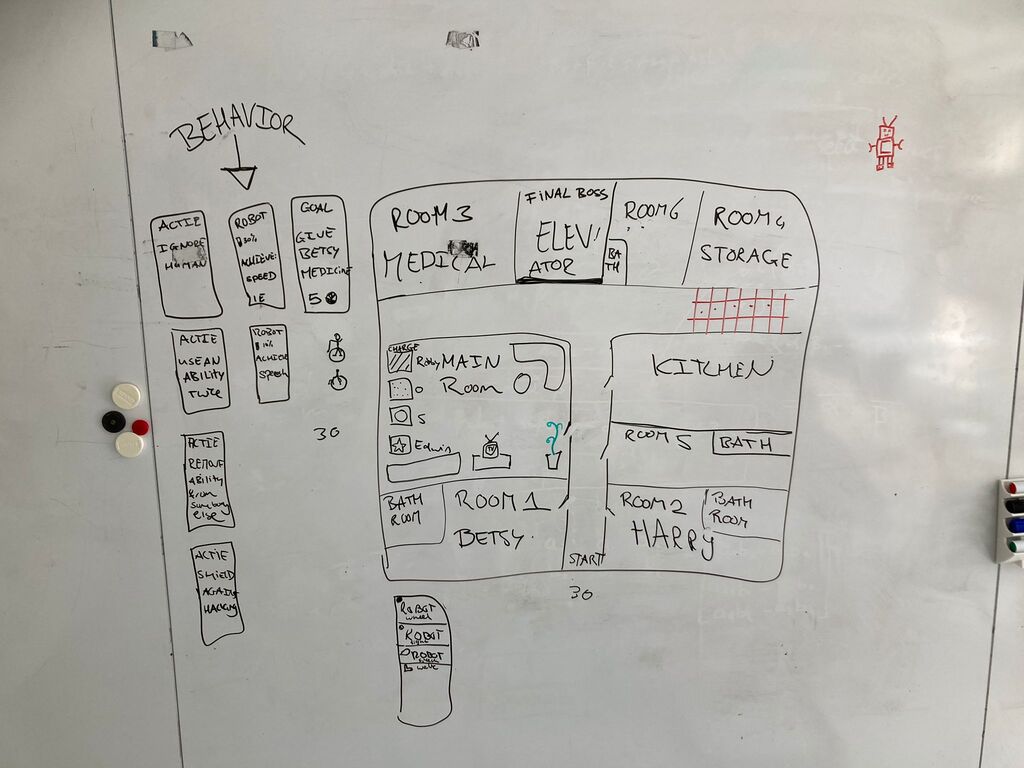 A game environment did feel more fitting and was closer to what we wanted to achieve, but creation of an online game is still quite a handful to do in the limited time we still had. We eventually settled on our final design for the tool: a board game. The possible effectiveness of a serious board game is shown by Sousa [4], who even adapted existing board games into serious board games, with positive results. The first sketch made during brainstorming is shown below in Figure 6.3. The board itself is the space where the robot is designed for, in our case an elderly home. It has different rooms and spaces such as personal rooms, a kitchen and a medical bay. The final ‘boss’ is to be able to enter the elevator.